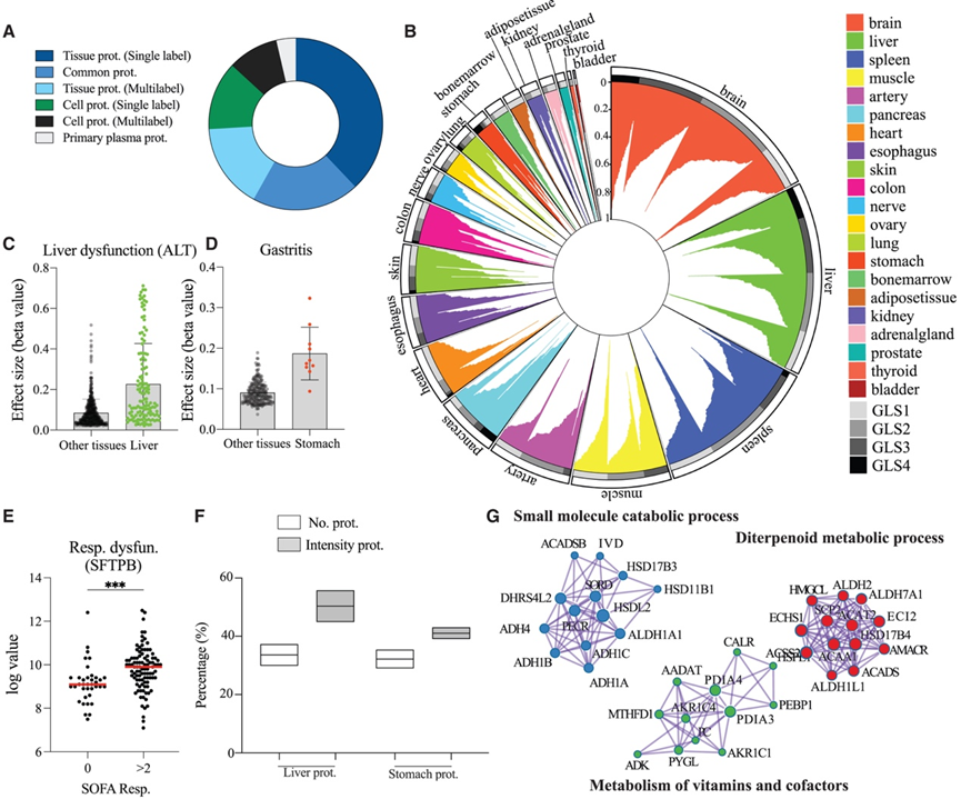 (A) 环形饼图显示了血浆中所有已识别的蛋白质以及根据全局分布图谱分配的全局蛋白质组的百分比分布。(B) 圆形条形图描绘了血浆中鉴定出的组织富集蛋白,并按其所属组织和 GLS 进行细分。(C-D) 点图显示组织富集蛋白及其与肝功能障碍和胃炎的蛋白质关联(效应大小)。(E) 点图显示呼吸功能障碍的脓毒症患者(SOFA 呼吸评分 > 2)与无呼吸功能障碍的脓毒症患者(SOFA 呼吸评分 = 0)的血浆蛋白质肺表面活性物质 B 水平。(F) 首先筛选出所有在血浆中检测到的、在肝脏和胃中富集的蛋白质。条形图比较了两份图谱(HATLAS 和 EMBL)中蛋白质比例与其在相应器官中的强度比例。(G) 富集字符串网络图,其中包含 (C) 中标记为“肝脏”的蛋白质。