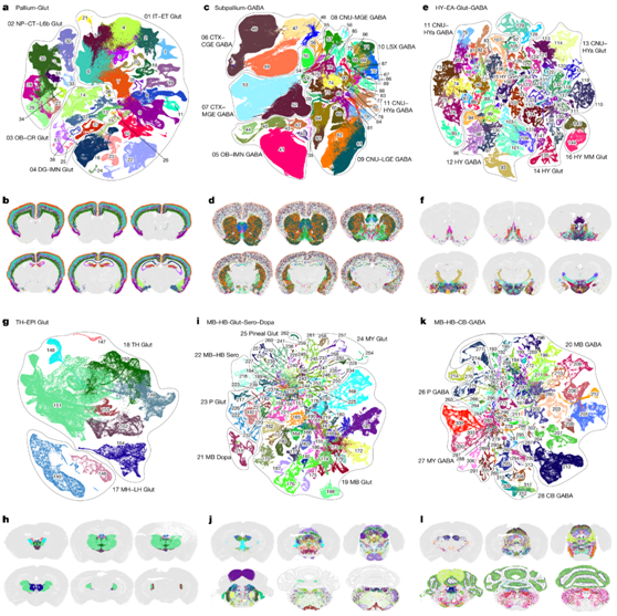 图1. 整个小鼠大脑的转录组细胞类型分类。