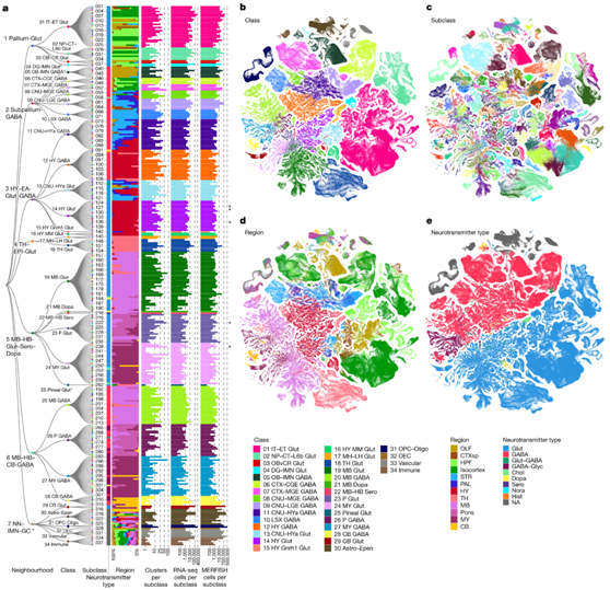 (a)以树状图组织的 338 个亚类的转录组分类树。(b-e) 所有细胞类型的 UMAP 表示,分别按类别、亚类、大脑区域和主要神经递质类型着色。