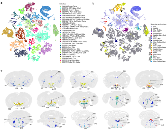 (a-b) 神经元亚类,包含释放调节性神经递质及其与谷氨酸和/或 GABA 的各种共释放组合的聚类。UMAP 按亚类和神经递质类型进行着色。 (c) 代表性MERFISH切片显示表达调节性神经递质的神经元类型的位置。