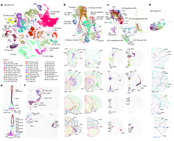 在所有的非神经元细胞类型中,Astro-Epen类表现出最多样化的空间模式。区域特异性星形胶质细胞Astro-OLF、Astro-TE、Astro-NT和Astro-CB在UMAP中按照从前到后的顺序排列(图4b),与它们的空间模式一致。室管膜的五个亚类——室管膜、室管膜、伸长细胞、室管膜和CHOR——分布在整个大脑脑室的不同部位,其中的聚类表现出精细的空间特异性(图4c)。脑室周围器官(CVO)是位于第三、第四脑室周围的特殊结构,介导脑、血液和脑脊液(CSF)之间的通信。它们是高度血管化的,内衬室管膜细胞和伸长细胞,作为脑与血液和/或脑脊液之间的选择性屏障。伸长细胞是一种特化的室管膜细胞,分布在下丘脑的第三脑室(V3)和正中隆起(ME)。他们确定了与每种亚型相对应的聚类:聚类5245/5246、5247、5249和5250分别为α1、α2、β1和β2(图4e)。他们还发现了长管细胞样室管膜细胞聚类,这些细胞聚类特异性位于其他CVO(图4c):聚类5243位于穹基下器官(SFO), 聚类5244位于终板血管器官[OV(也称为OVLT)], 聚类5240位于最后区(AP),以及聚类5263(Sspo标记)位于亚联合器官(SCO)。