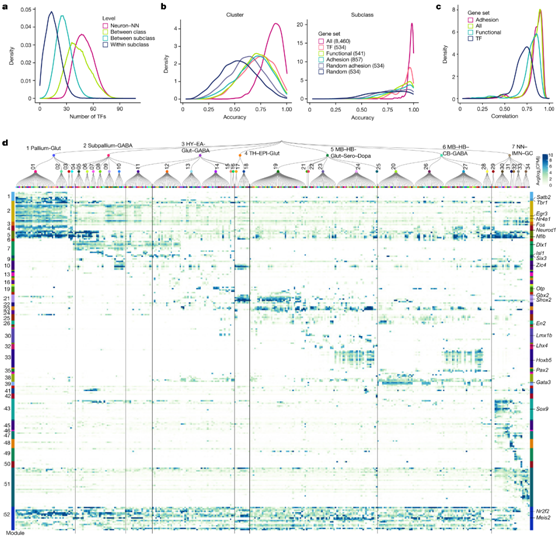 (a) 神经元和非神经元类之间、类之间、亚类之间和亚类内差异表达转录因子(TF)数量的分布。 (b) 使用基于所有 8460 个标记基因(全部)、534 个转录因子标记基因、541 个功能标记基因、857 个编码粘附分子的标记基因构建的分类器。 (c) 密度图,显示使用所有标记、粘附标记基因、功能基因和转录因子的聚类之间标记基因表达相关性的分布。 (d) 分类树中每个亚类的关键转录因子的表达,组织在转录因子共表达模块中,在热图两侧显示为彩条。