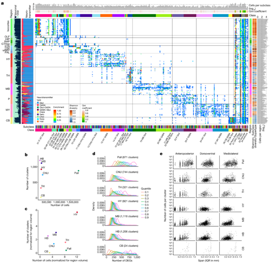 (a) 热图显示 MERFISH 细胞的每个亚类(x轴)中的CCFv3 区域分布(y轴)。 (b) 散点图显示每个主要大脑区域识别的神经元聚类数量与相应区域中 scRNA-seq 分析的神经元细胞数量。(c) 与(b)相同,不同之处在于聚类和轮廓细胞的数量按区域体积标准化。(d) 每个主要大脑区域内每对神经元聚类之间的 DEG 数量的分布。 (e) 散点图显示映射到给定神经元聚类的细胞数量与基于 MERFISH 数据集的前后轴、背腹轴和中外侧轴的 3D 坐标跨度的关系,按主要大脑区域分层。