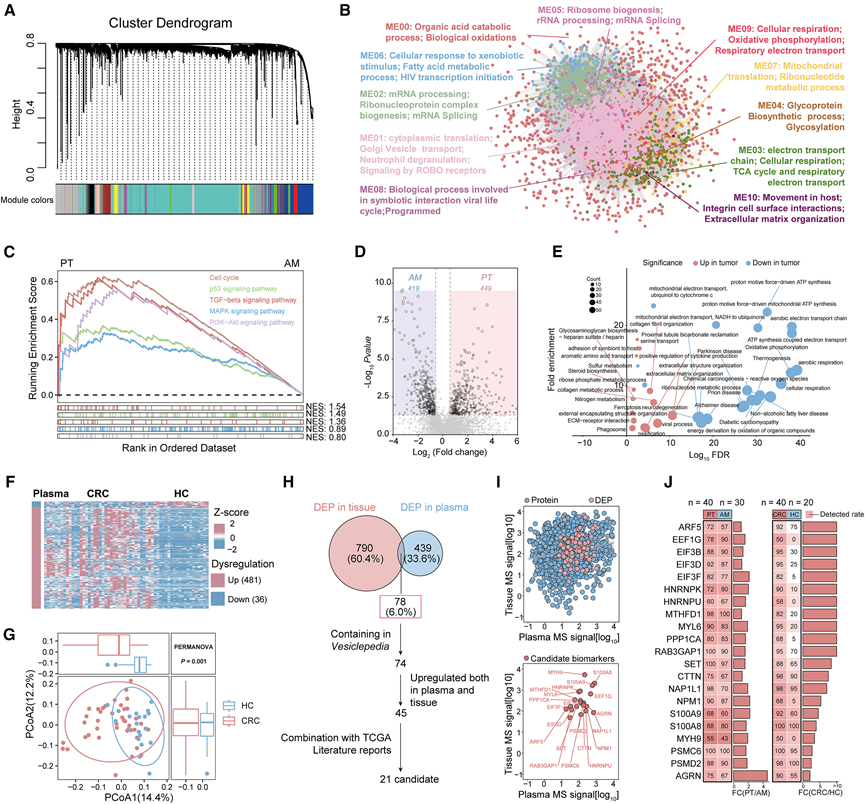 (A) WGCNA 基于组织 EV 蛋白质组鉴定出 11 个功能性蛋白质模块。(B) 11 个功能性蛋白质模块(ME00–10)的网络图,每个网络节点代表一种蛋白质,并按不同的功能模块用颜色编码。(C) 比较PT 和 AM 的 CRC 相关通路的 GSEA。(D) 火山图显示PT组织EV和AM组织EV之间差异丰度蛋白质。(E) 点图显示基于显著上调/下调蛋白质识别出的富集通路。(F) 聚类热图显示 CRC 患者和健康个体血浆 EV 中的 EV 蛋白存在差异。(G) 基于血浆 EV 样本 Bray-Curtis 距离的主坐标分析 (PCoA)。(H) 整合组织 EV 和血浆 EV 蛋白质组学以揭示 CRC 诊断的候选生物标志物。(I) 组织-血浆EV蛋白质组丰度图,显示组织EV中蛋白质强度中值(以MS强度评估)与血浆中蛋白质强度中值的关系。(J) 热图显示了组织EV样本(左)和血浆EV样本(右)中21个选定候选生物标志物的中位强度和检出率。