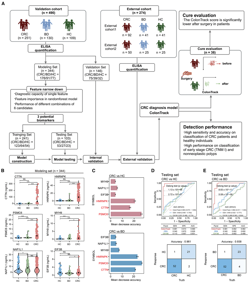 (A) 基于 ELISA 定量结果的诊断模型构建和评估工作流程。(B)候选生物标志物的 ELISA 定量比较。(C) 随机森林算法生成的变量重要性图,以CRC与HC(上)和CRC与BD(下)的准确率下降平均值来衡量。(D) (上) ColonTrack 模型、CEA 和 CA19-9 在区分 CRC 患者和 HC 患者时的 ROC 曲线,(下)显示了在测试集中对 CRC 与 HC 进行分类的混淆矩阵。(E) (上)显示了 ColonTrack 模型、CEA 和 CA19-9 在区分 CRC 患者和 BD 患者时的 ROC 曲线,(下)显示了在测试集中对 CRC 与 BD 进行分类的混淆矩阵。