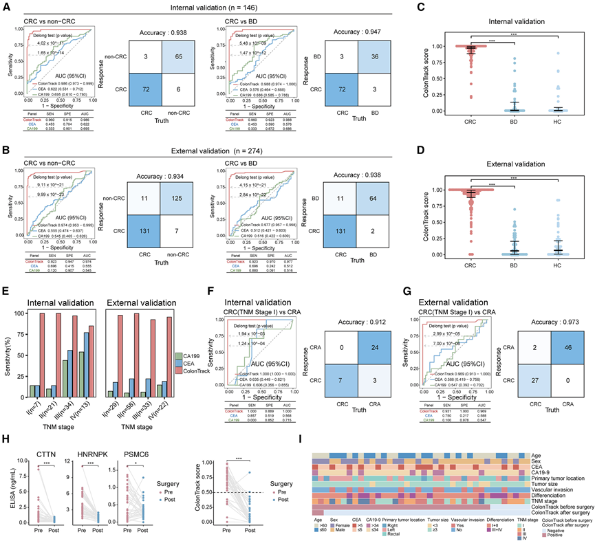 (A)ColonTrack 模型、CEA 和 CA19-9 在区分 CRC与 HC和BD患者时的 ROC 曲线,以及在内部验证集中对 CRC 与 HC 或 CRC 与 BD 进行分类的混淆矩阵。(B) ColonTrack 模型、CEA 和 CA19-9 在区分 CRC与 HC和BD患者中的 ROC 曲线,以及在外部验证集中对 CRC 与 HC 或 CRC 与 BD 进行分类的混淆矩阵。(C-D) CRC、BD 和 HC 的 ColonTrack 分数。(E) ColonTrack模型、CEA和CA19-9对内部验证集和外部验证集中不同TNM分期CRC患者的检测灵敏度。(F) ColonTrack 模型、CEA 和 CA19-9 在区分早期(TNM 分期 I)CRC 患者与 CRA 患者时的 ROC 曲线,以及在内部验证集中对 CRC 与 CRA 进行分类的混淆矩阵。(G) ColonTrack 模型、CEA 和 CA19-9 在区分早期(TNM 分期 I)CRC 患者与 CRA 患者时的 ROC 曲线,以及在外部验证集中对 CRC 与 CRA 进行分类的混淆矩阵。(H) 通过比较手术前后的 ELISA 检测结果,发现 CRC 患者血浆 EV中的 CTTN、HNRNPK 和 PSMC6 表达水平在手术后显著下调。(I) 术后患者临床指标。