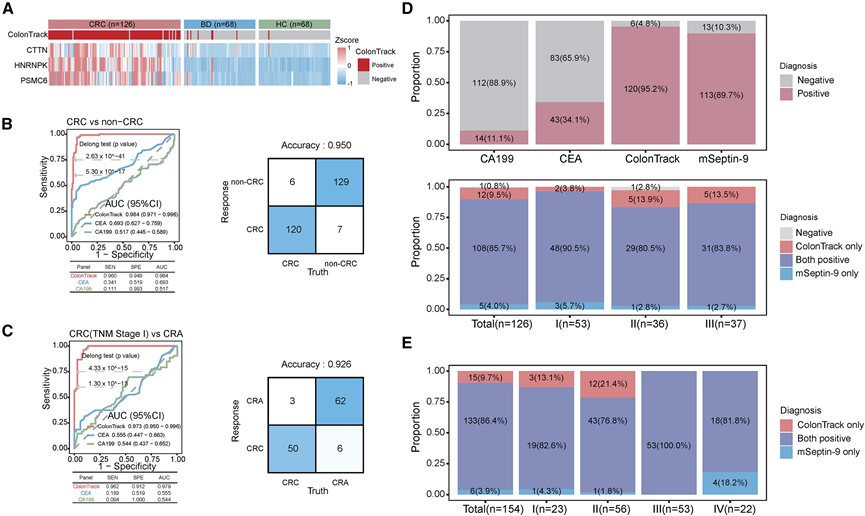 (A) 热图显示CTTN、HNRNPK和PSMC6的表达水平及ColonTrack的诊断结果。(B) ColonTrack 模型、CEA 和 CA199 在区分 CRC 患者与非 CRC 患者时的 ROC 曲线,以及在附加队列中对 CRC 与非 CRC 进行分类的混淆矩阵。(C) ColonTrack 模型、CEA 和 CA199 在区分 CRC患者和 CRA患者中的 ROC 曲线,以及在附加队列中对 CRC 与 CRA 进行分类的混淆矩阵。(D) 不同指标的 CRC 阳性率(上)以及附加队列中 CRC 不同阶段的 ColonTrack 和 mSeptin-9 检测率(下)。(E) 回顾性队列中不同 CRC 阶段的 ColonTrack 和 mSeptin-9 CRC 阳性率。