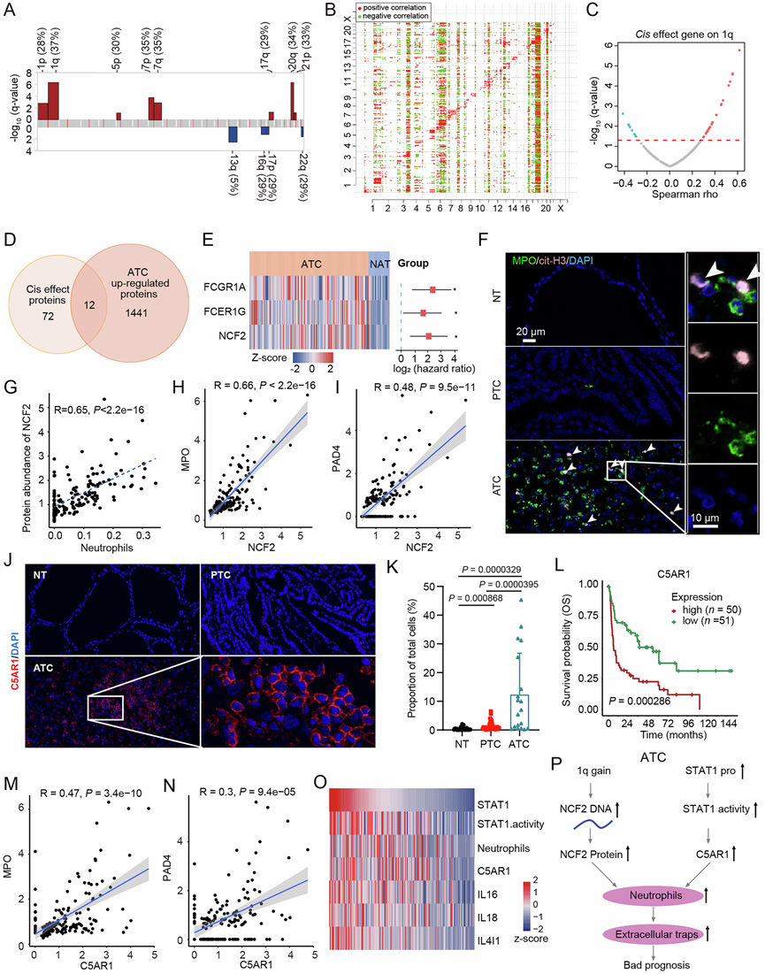 (A) 条形图显示 ATC 和 PDTC 样本中基于拷贝数变异 (CNA) 的染色体臂显著改变。(B) 热图显示 ATC 和 PDTC 样本中拷贝数变异与蛋白质丰度之间的相关性。(C) 散点图显示 1q 染色体臂区域基因的 CNA 与其蛋白质丰度之间的 Spearman 相关性。(D) 维恩图显示 1q 区域的顺式效应基因与 ATC 中显著上调的蛋白质之间的重叠。(E) 重叠部分中前三种蛋白质的表达和生存风险评分。(F) 免疫荧光染色分析。(G) 散点图显示基于 xCell 计算的 NCF2 蛋白质丰度与中性粒细胞评分之间的 Spearman 相关性。(H-I) ATC/PDTC 样本中 NCF2、MPO 和 PAD4 丰度的 Spearman 相关性。(J-K) 免疫荧光染色分析。(L) ATC 或 PDTC 患者中 C5AR1 与总生存期的相关性。(M-N) ATC/PDTC 样本中 C5AR1、MPO 和 PAD4 丰度的 Spearman 相关性。(O) 热图显示 STAT1 的表达和活性及其对其下游底物蛋白的调控作用与中性粒细胞浸润相关。(P) 流程图显示与ATC患者不良预后相关的潜在生物学机制。