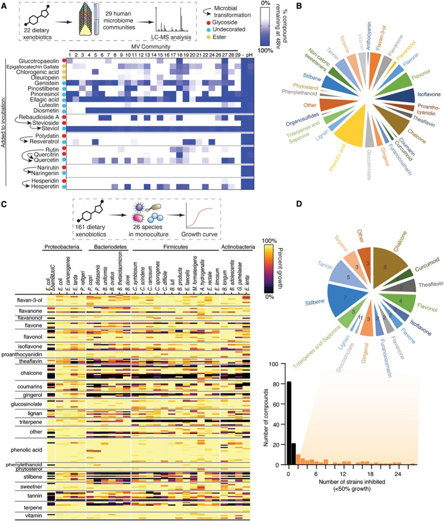 本项研究绘制了约 150 种小分子膳食异生物质与肠道微生物之间的相互作用,包括这些化合物对群落组成的影响、人类肠道微生物对膳食异生物质的代谢活动以及这些特征的个体间差异。微生物代谢可以毒化和解毒这些化合物,产生新兴的相互作用,解释膳食异生物质对群落特定重塑的影响。本项研究确定了负责解毒一种膳食异生物质白藜芦醇的基因和酶,并证明这种酶有助于白藜芦醇对群落重塑的个体间差异。总之,这些结果系统地绘制了膳食异生物质与肠道微生物之间的相互作用,并将毒化和解毒与微生物群对饮食反应的个体差异联系起来。