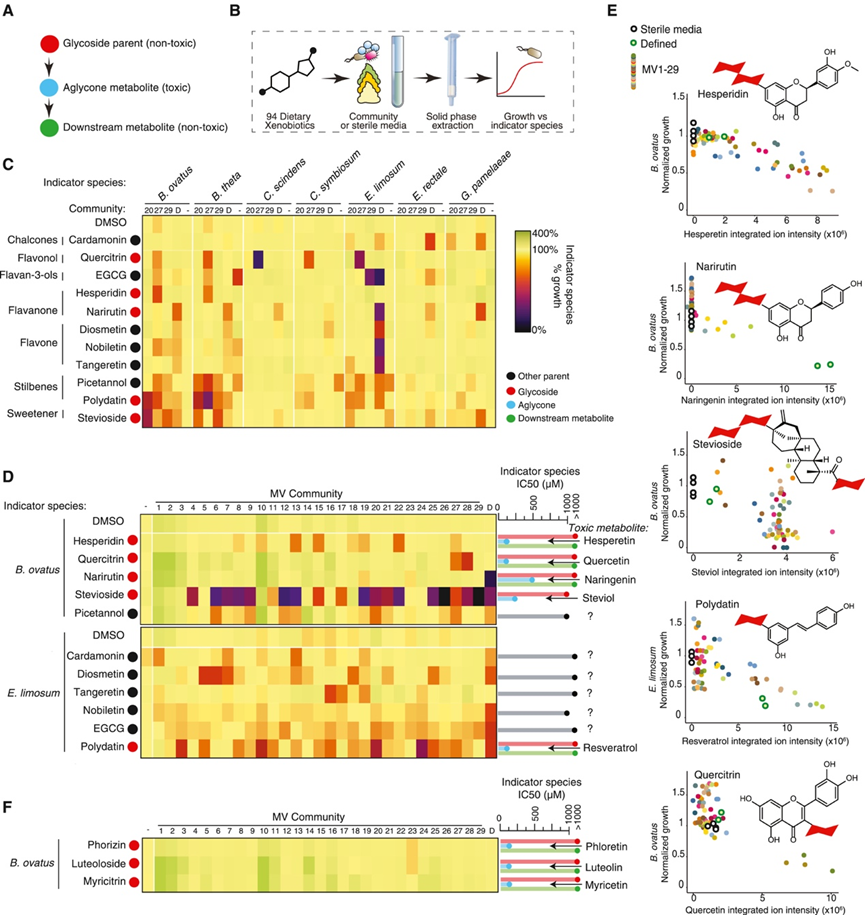 这些有毒化合物中有五种(橙皮苷、柚皮芦丁、槲皮苷、甜菊苷和虎杖苷)是糖苷,其糖苷配基形式表现出毒性,但其下游代谢物无毒(图 4 A)。几乎所有 29 个人类群落都将这些糖苷去糖基化为有毒的糖苷配基,但随后在某些群落中以不同的方式代谢为无毒的下游代谢物,而在其他群落中则没有。与 29 个群落一起孵育的化合物提取物中的糖苷配基丰度与指示物种的生长抑制之间的相关性表明这些糖苷配基是造成观察到的毒性的原因(图 4 E)。群落 MV20 对糖苷白藜芦醇的毒性就是一个例子:他们将白藜芦醇与 MV20 一起孵育,使用活性引导纯化分离孵育过程中产生的毒性因子,并使用 LC-MS 将该因子鉴定为白藜芦醇糖苷配基白藜芦醇。一些化合物可能还会诱导群落产生不相关的代谢物,从而增加或减少指示物种的生长。例如,这可以解释以下观察结果:虽然这些提取物中的甜菊醇含量相似,但从不同群落与甜菊苷孵育中制备的提取物对B. ovatus生长的影响却不同(图 4 E)。