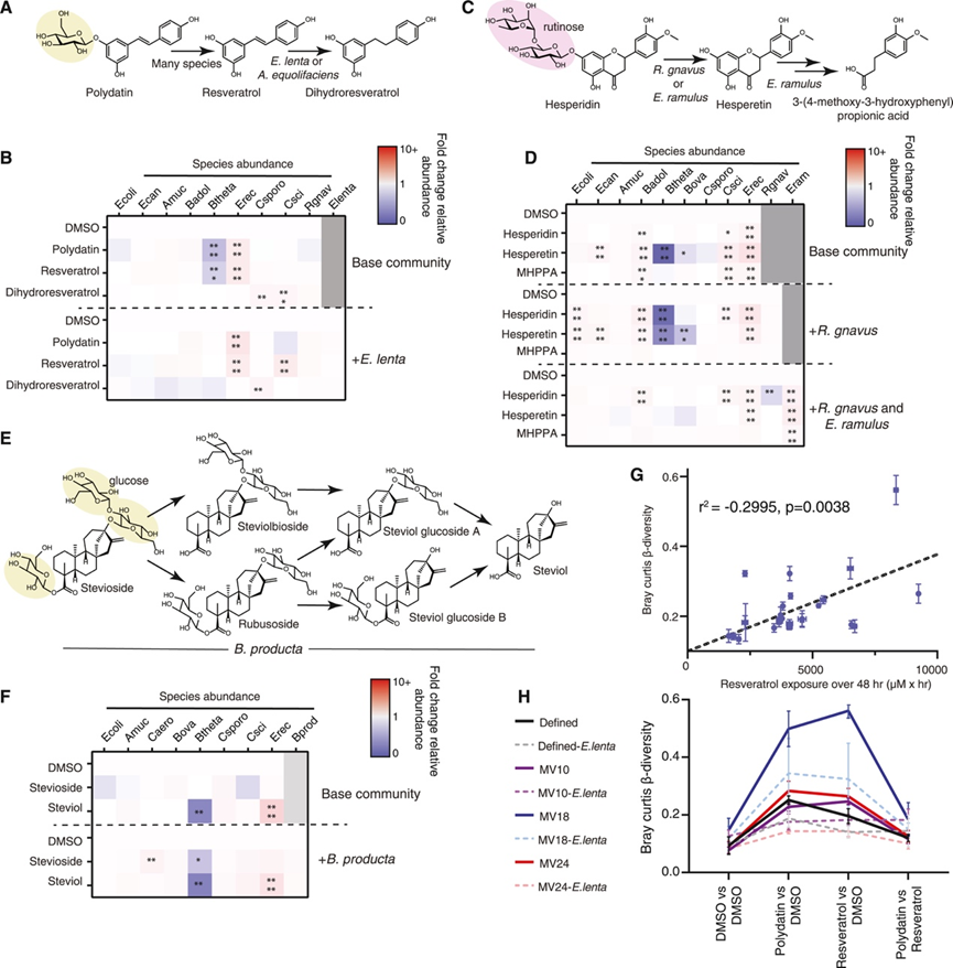 (A-F) 白藜芦醇苷、橙皮苷和甜菊苷在体外重塑 8-10 个成员的定义群落。(G)β-多样性与白藜芦醇暴露之间的相关性。(H) 添加E. lenta可调节响应虎杖苷或白藜芦醇的群落重塑。