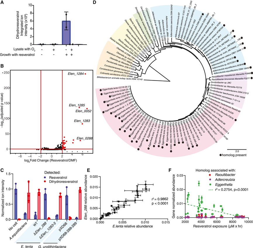 (A) 检测100 μM 白藜芦醇的情况下生长的E. lenta产生的无细胞裂解物将白藜芦醇还原为二氢白藜芦醇的能力。(B) 火山图显示在 100 μM 白藜芦醇或载体(二甲基甲酰胺 [DMF])存在下生长的E. lenta的差异转录本丰度。(C) 通过体外培养和 LC-MS测量各种物种或菌株将白藜芦醇代谢为二氢白藜芦醇的能力。(D) 96 种红蝽杆菌菌株的系统发育树,其中存在Elen_288同源物。(E) 使用基因和物种特异性引物通过 qPCR 测定体外生长的 29 个 MV 群落中Elen_288的丰度和E. lenta的丰度之间的相关性。(F) 不同属(Eggerthella、Adlercreutzia和Raoultibacter)相关的白藜芦醇还原酶同源物的丰度与体外培养的 29 个 MV 群落的白藜芦醇代谢速率之间的相关性。