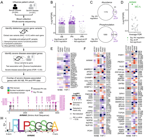 为了分析本项研究的蛋白质组学研究中的蛋白质是否影响具有与严重流感疾病相关的变异的基因,他们在蛋白质组数据集中探究了预测的功能丧失(pLOF)变异,因为这些变异不仅更容易预测,而且比功能获得突变或同义突变具有更容易理解的分子后果。如果识别为非同义外显子、移码替换或停止增益/丢失(MAF < 1%),则将变体分类为 pLOF,并从六种注释算法中的任何一种预测为有害。总共有 2808 个 AB 基因、3092 个 PH 基因和 177 个 PPI 基因具有 pLOF 变异。他们测试了1082个AB基因、2336个PH基因和118个PPI基因与严重流感疾病的关联(图 4B),并鉴定了 24 个 AB、49 个 PH 和 5 个 PPI 与 pLOF 变异显著的严重疾病相关基因。为了进一步分析具有 pLOF 变异的基因和本项研究的蛋白质组数据集,他们将 95 个 AB、161 个 PH 和 7 个 PPI 基因视为具有与严重疾病相关的 pLOF 变异的中等显著基,以包括更多具有较小影响的基因(图4B-D)。通过观察蛋白质组和患者数据集的重叠,他们发现 23 个 AB 和 52 个带有 pLOF 变异的 PH 基因在 IAV 感染期间受到显著调节(图 4C-F)。在本项研究的蛋白质组学和pLOF分析的交汇处,有44种具有pLOF变异的蛋白质在所有三个蛋白质组学数据集中检测到:AB、PH和PPI(图4D)。重点关注这些蛋白质组学检测到的具有 pLOF 变异的基因,并分析了三个数据集测试中严重流感疾病关联 FDR 的平均值,他们发现其中两个超过了显著性阈值:AHNAK和SEL1L。SEL1L 与 H3N2 HA 相互作用,虽然在 AB 和 PH 数据集中都检测到,但在 IAV 感染过程中,它在蛋白质水平上并未受到显著调节。相反,他们发现NHBE和THP1细胞中的所有三种IAV毒株均显著下调H5N1 NEP相互作用子AHNAK的蛋白AB(图 4E),并且在多个磷酸化位点上的磷酸化有显著变化。至少一种IAV毒株的至少一种细胞类型(图 4F)。他们观察所有 AHNAK 预测的磷酸化位点,以及本项研究数据集中所有显著调节的磷酸化位(图 4 G),他们发现丝氨酸位置 210 包含丝氨酸到脯氨酸或谷氨酰胺的磷酸化破坏突变(S210P/Q)与严重疾病显著相关(图 4H)。总之,本项研究的数据明确了 AHNAK 对感染的分子调节如何反映 AHNAK 的全身效应,因为它与宿主疾病的严重程度有关。