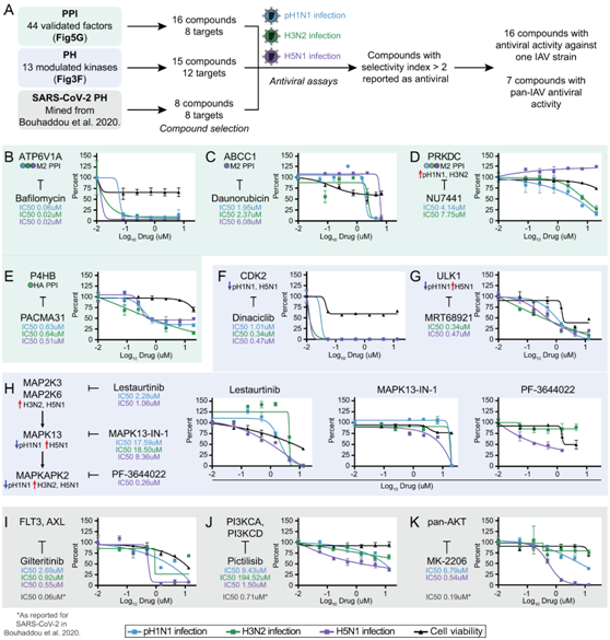 (A) 针对 8 个 IAV PPI 因子和 12 个 IAV 调节激酶的化合物。 (B-G)靶向化合物的剂量反应曲线。(H) MAPK 途径成员的剂量反应曲线。(I-K) 针对 SARS-CoV-2 的抗病毒化合物的剂量反应曲线。