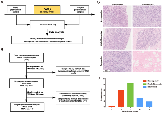 (A) 新辅助化疗 (NAC) 背景下的样本采集示意图,随后进行全外显子组测序 (WES)、RNA 测序 (RNA-seq) 和数据分析。(B) NACBC 测序集中用于分析的最终样本数量。 (C) 通过苏木精-伊红染色获得的有反应、中等反应和无反应患者的代表性肿瘤病理图像。 (D) 不同 Miller-Payne 评分患者在有反应组、中等反应组和无反应组中的分布。