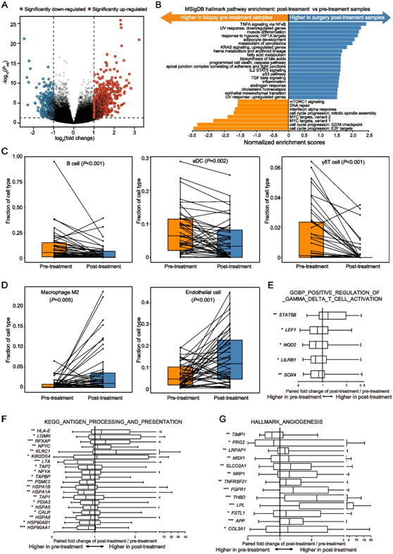 (A) 火山图显示匹配的治疗前和治疗后肿瘤之间的差异表达基因 (DEG)。(B) NAC 之后显著下调和上调的通路。(C-D) 治疗前和治疗后肿瘤中 B 细胞、M2 巨噬细胞、活化树突状细胞 (aDC)、内皮细胞和 γδT (γδT) 细胞的分数。 (E-G) DEG的表达与治疗前后肿瘤之间γδT 细胞活化、抗原加工和呈递以及血管生成的正向调节显著相关。