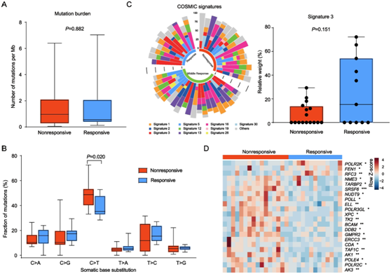 图4. 治疗前肿瘤中的突变特征。无反应组和反应组之间肿瘤突变负荷