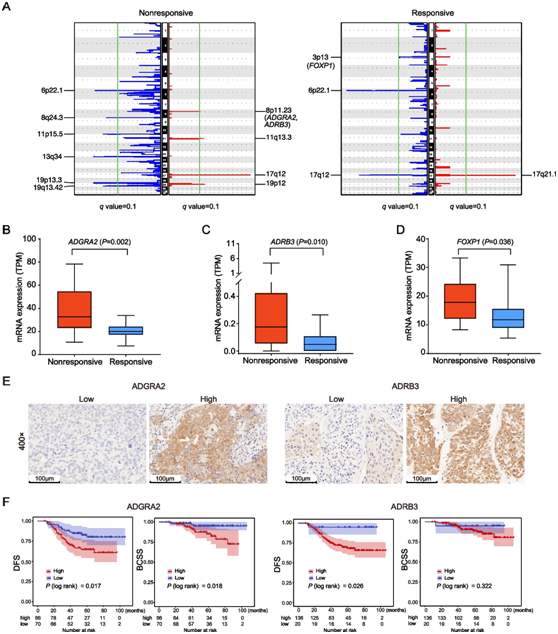 (A) GISTIC2.0 在治疗前无反应和有反应的肿瘤中识别出的 SCNA 信号图谱。RNA-seq 数据中无反应和有反应的治疗前肿瘤中ADGRA2 (B)、ADRB3 (C) 和FOXP1 (D)的 mRNA 表达水平以每百万转录本 (TPM) 表示。(E) NACBC 验证集中 ADGRA2 和 ADRB3 低表达和高表达的肿瘤的代表性免疫组织化学染色。 (F) Kaplan-Meier 对 NACBC 验证集中的 DFS 和 BCSS 进行分析。