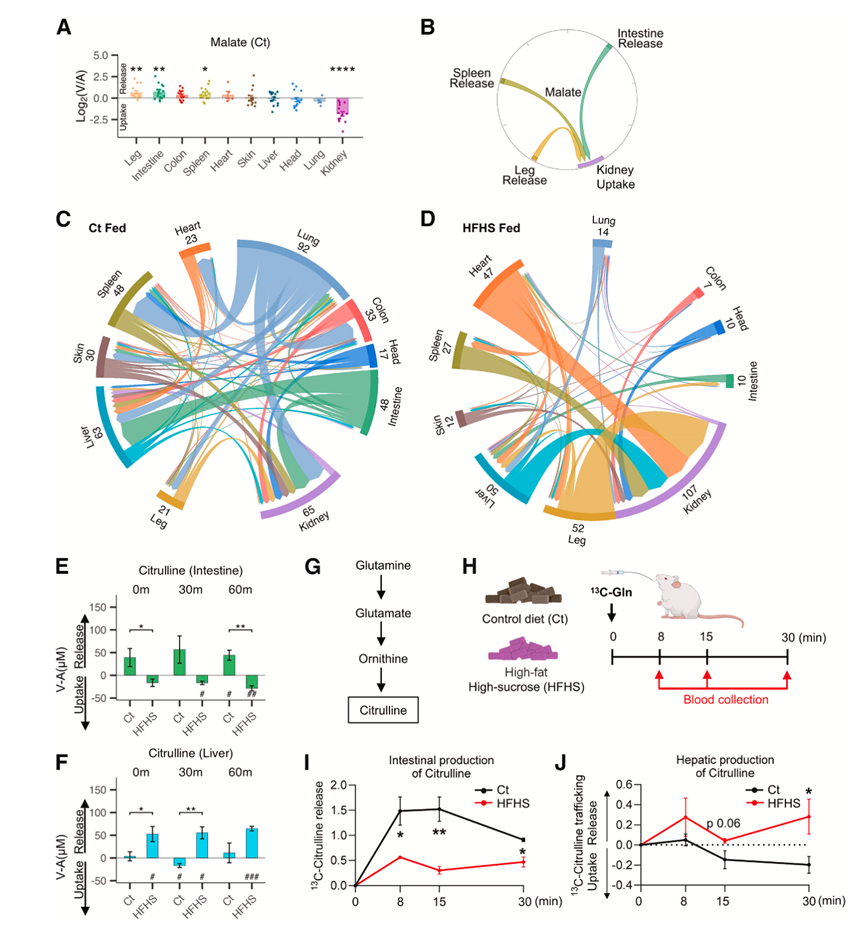 (A-B) 在所有时间点,Ct 饮食喂养猪的腿部、肠道和脾脏释放的苹果酸以及肾脏的吸收情况,绘制为弦图,其中钝端表示源器官(腿部、肠道和脾脏),箭头端表示汇器官(肾脏)。颜色表示每个颜色编码的器官。(C-D) Chord 图显示 Ct 组或 HFHS 组猪在进食状态(120 分钟)下器官间代谢物的运动情况。(E-F) Ct 和 HFHS 饮食喂养的猪的肠道和肝脏中的瓜氨酸运输比较。(G-H) 谷氨酰胺合成瓜氨酸的示意图和喂食 Ct 和 HFHS 饮食的小鼠体内[U-13C]-谷氨酰胺 (Gln) 的时间过程追踪。(I-J) 肠道(门静脉/动脉)和肝脏(下腔静脉/门静脉)中13C -瓜氨酸的产生。
