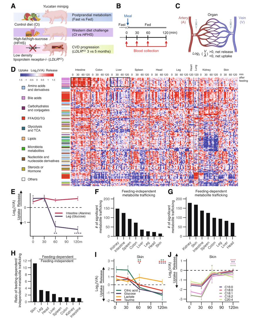 (A)实验示意图。(B) 提供流质饮食之前和之后 AV 血液采样的时间过程示意图。(C) AV 梯度测量示意图,用于确定器官特异性净吸收或代谢物的释放。(D) 热图显示,在Ct饮食喂养的猪中,217种循环、分类代谢物在至少一个器官特异性时间点表现出显著的运输。(E)依赖和不依赖进食的器官特异性代谢物运输示例。(F-G) 跨器官代谢物运输数量,非摄食依赖性和摄食依赖性。(H) 依赖喂养和不依赖喂养的代谢物运输事件的比例。(I-J) 进食引起的变化示例,显示皮肤对代谢物的吸收增加或减少。