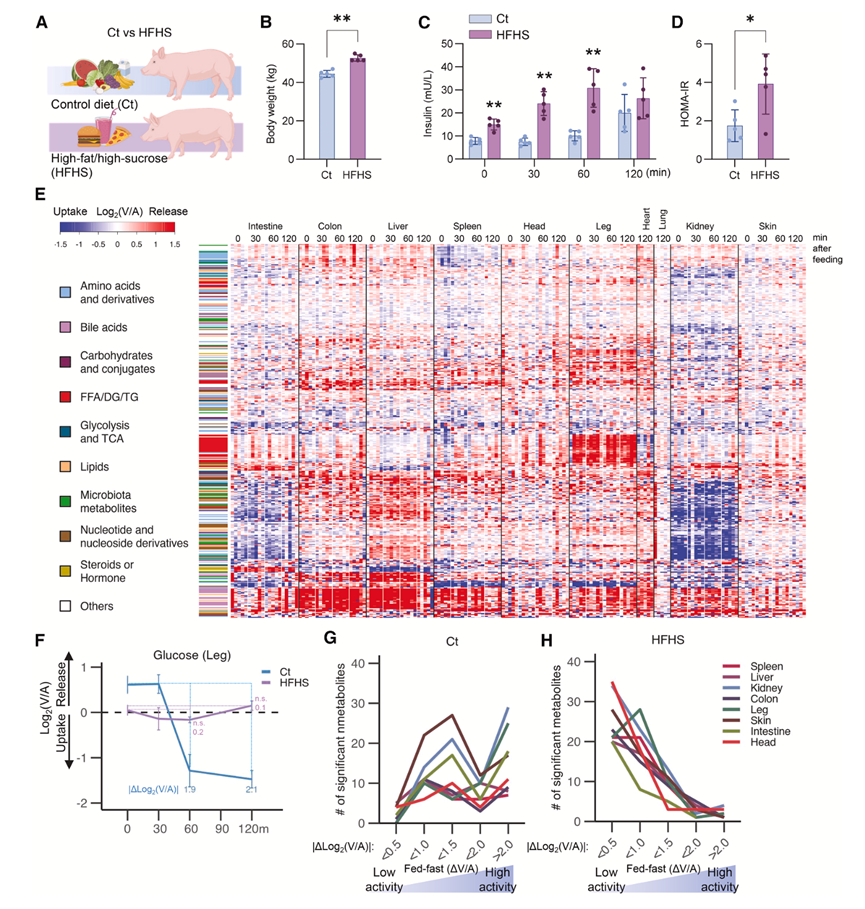 (A) 饲喂 Ct 或 HFHS 饮食的猪的 AV 研究示意图。(B-D) HFHS饮食增加体重、动脉血胰岛素以及通过空腹血糖和胰岛素计算出的HOMA-IR 。(E) 热图显示,在HFHS饮食喂养的猪中,403种循环、分类代谢物在至少一个器官特异性时间点表现出显著的变化。(F) 比较Ct和HFHS饮食喂养猪腿部葡萄糖运输情况。(G-H) Ct 组和 HFHS 组饲喂的猪,60 分钟时相对于 0 分钟时表现出显著变化的代谢物数量。