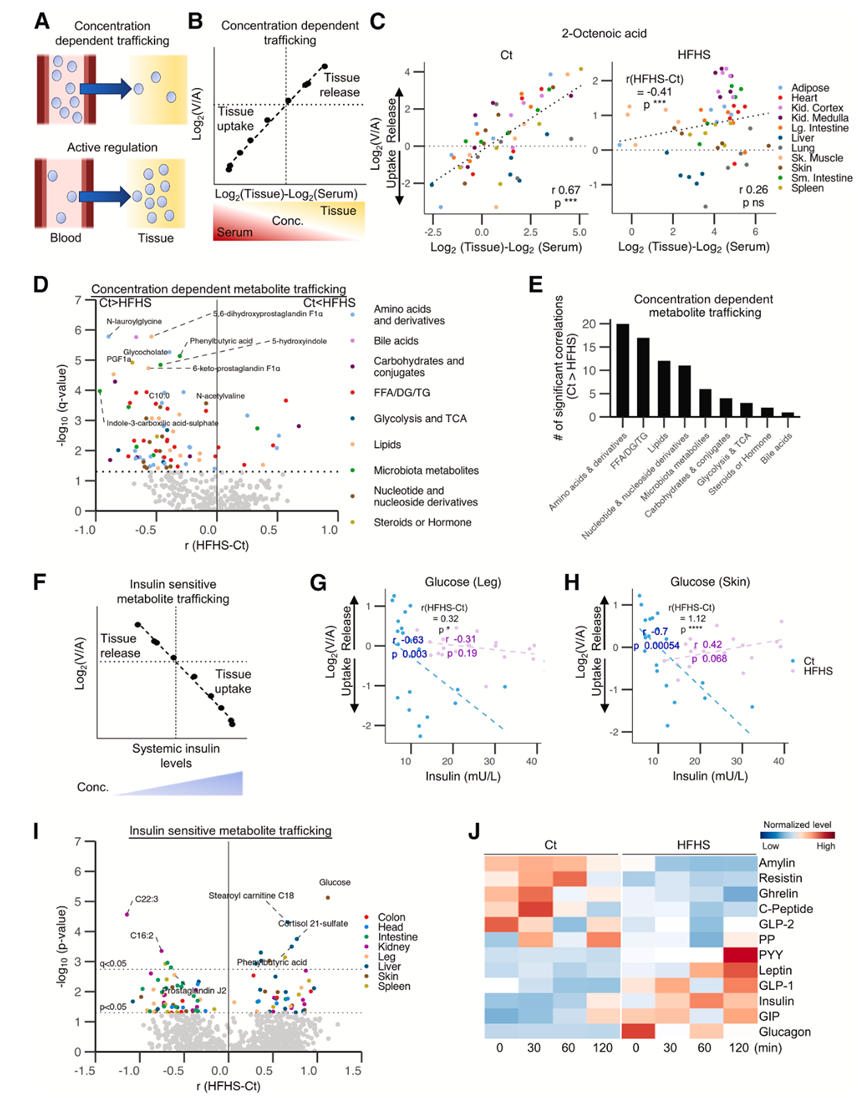 (A) 由浓度梯度或主动调节驱动的代谢物运输示意图。(B) 代谢物组织-血液浓度梯度(x轴)与运输(y轴)相关性分析示意图。(C) Ct(左)和 HFHS(右)饮食喂养猪中 2-辛烯酸的组织-血液浓度梯度与跨器官运输之间的相关性。(D) 火山图突出显示了在线性回归拟合后饮食之间的相关系数 r (HFHS-Ct) 存在显著差异的代谢物。(E) 不同饮食之间相关系数存在显著差异的不同类别代谢物的数量。(F) 血液胰岛素水平(x轴)和代谢物运输(y轴)之间的相关性分析示意图。(G-H) Ct 和 HFHS 饮食喂养猪的血液胰岛素水平与腿部或皮葡萄糖摄取量之间的相关性。(I) 火山图突出显示了经线性回归拟合后,不同饮食间相关系数r(HFHS-Ct)存在显著差异的代谢物。(J) 热图显示Ct和HFHS饮食喂养猪的动脉血中相应内分泌激素的标准化水平。
