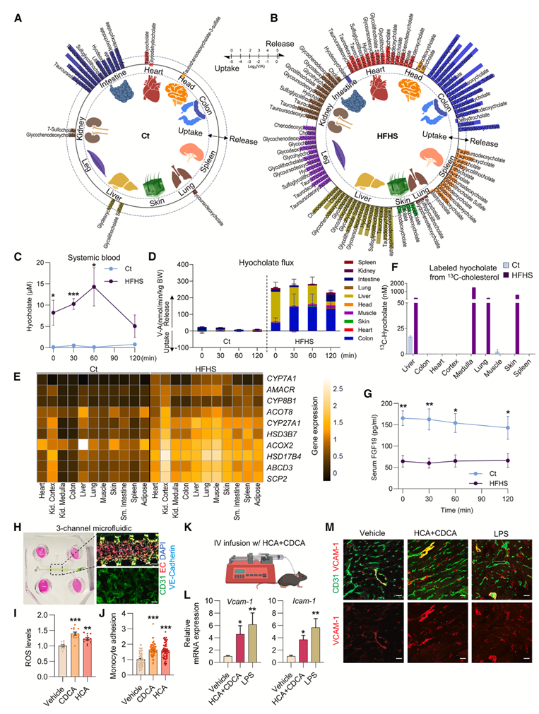 (A-B) 圆形图显示,Ct 饮食喂养猪的肠道和 HFHS 饮食喂养猪的多个器官均显著释放 BA(餐后 60 分钟)。(C) Ct组和HFHS组猪血液HCA水平比较。(D) Ct 和 HFHS 饮食喂养猪的器官 HCA 流出量比较,通过 VA 浓度梯度和局部血流计算。(E) 热图显示了代表性胆碱合成酶和转运蛋白的 RNA-seq的基因分析。(F) 从Ct和HFHS饮食喂养的猪体内新鲜分离的离体培养器官,在含有13C-胆固醇的培养基中孵育24小时后,产生的标记HCA的培养基浓度。(G) Ct组和HFHS组猪动脉血FGF19水平比较。(H) 用CD31(绿色)、VE-钙粘蛋白(青色)和DAPI(蓝色)染色的RFP标记EC的3D培养。(I-J) ROS 水平。(K) 使用自由移动的颈静脉导管小鼠的 BA 静脉(IV)输注装置示意图。(L) Vcam-1和Icam-1基因的表达情况。(M) 小鼠心脏中输注载体、BA 或 LPS 后 CD31(绿色)和 VCAM-1(红色)的代表性免疫荧光染色图像。