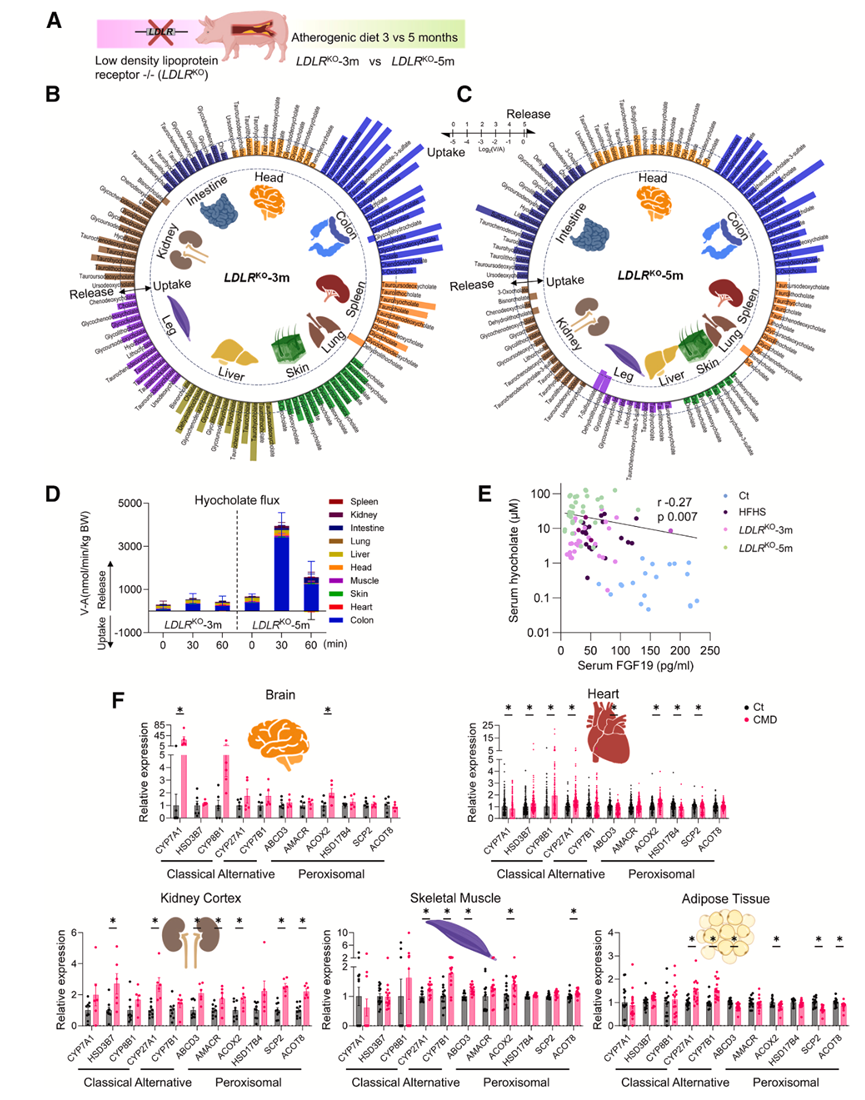 (A) 饲喂致动脉粥样硬化饮食 3 或 5 个月的LDLRKO猪的示意图。(B-C) 圆形图显示LDLRKO -3 个月和LDLRKO -5 个月猪的多个器官显著释放 BA(餐后 30 分钟)。(D) LDLR KO -3个月和LDLR KO-5个月猪器官HCA流出量。(E) 动脉血 FGF19 和 HCA 水平之间的相关性。(F) 已发表的11种胆碱合成酶及其相关基因在对照组和CMD患者中的组织基因表达情况。
