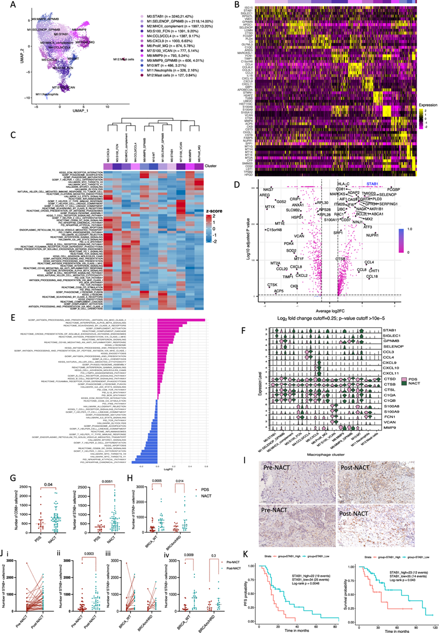 (A) UMAP 显示 来自 7 名患者(3 名 PDS 和 4 名 NACT)的整合髓系细胞亚群。(B) 热图显示每个聚类中上调最多的五个基因。(C) 巨噬细胞聚类中的差异富集通路,GSVA 分析。(D) 差异表达基因分析。(E)差异富集通路分析。(F) 每个巨噬细胞聚类中 PDS(粉色)和 NACT(绿色)中选定基因表达水平的小提琴图。(G) HGSOC 网膜mm2 的CD68和 STAB1 阳性细胞。(H) 比较BRCA 野生型和 BRCA 突变/HRD 患者的 PDS 和 NACT 中的 STAB1 阳性细胞/mm2。(I) 免疫组织化学染色。(J) 患者匹配样本中的 STAB1 阳性细胞。(K) Kaplan -Meier 生存和 PFS 曲线。