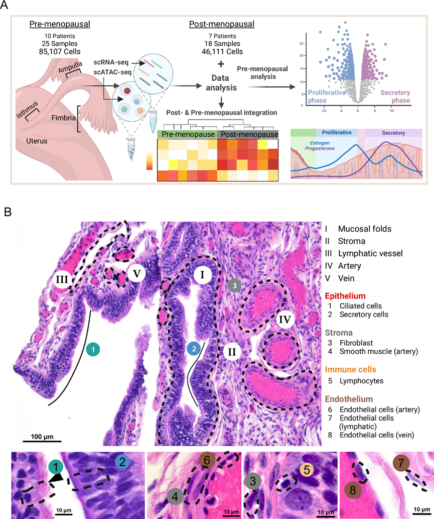 本研究使用scRNA-seq和scATAC-seq技术构建了月经周期和更年期健康人类输卵管的综合细胞图谱,对 85107 个绝经前输卵管细胞和 46111 个绝经后输卵管细胞进行了比较,发现在绝经和月经周期期间细胞类型频率、基因表达、转录因子活性和细胞间通讯发生了显著变化。月经周期依赖性的激素变化调节输卵管分泌上皮细胞的不同分子状态。绝经后输卵管在与衰老相关的转录因子(如 Jun、Fos 和 BACH1/2)中表现出较高的染色质可及性,而激素受体普遍下调,一小部分分泌上皮细胞具有ESR2、IGF1R和LEPR的高表达。绝经前分泌上皮基因聚类在免疫反应分子亚型中富集,而绝经后分泌上皮细胞中表达的一组基因在高级别浆液性卵巢癌的间充质分子类型中富集。