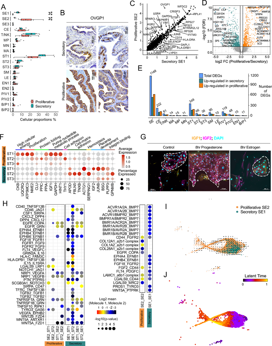 (A) 基于 scRNA-seq 数据的月经周期增殖期和分泌期之间的细胞组成差异。(B) 增殖期和分泌期患者输卵管中的代表性 OVGP1 免疫组织化学。(C)比较绝经前 SE1(分泌期)和 SE2 细胞(增殖期)的基因表达水平的散点图。(D) 火山图显示了基于增殖期和分泌期 SE 细胞(SE 1/2/3-pre)中表达基因的差异表达基因分析。(E) 基于 scRNA-seq 数据的细胞聚类在月经周期增殖期和分泌期之间差异表达基因的数量。(F) 点图显示在 ST 亚型中在增殖期和分泌期不同的选定基因的标准化 scRNA-seq 衍生基因表达水平。(G) 代表性免疫荧光染色。(H) CellPhoneDB 检测到的 SE和ST 亚型(左)之间以及月经期分隔的 SE 细胞(右)之间的配体-受体相互作用。(I) SE1-pre和 SE2-pre 细胞的 RNA 速度分析。(J) 月经周期增殖期和分泌期绝经前 SE 细胞的中位潜伏期,突出显示 SE1-pre和 SE2-pre 的时间位置。