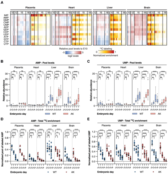 (A) 蓝色到红色刻度:热图代表相对于 E10.5 胎儿组织(胎盘、心脏和大脑)或来自野生型 (WT) 母鼠的胎儿肝脏的 E12.5 核苷酸库水平。(B-C)胎儿组织中的相对 AMP 和UMP水平。 (D-E) 胎儿组织中 AMP和 UMP的标准化总13C 富集