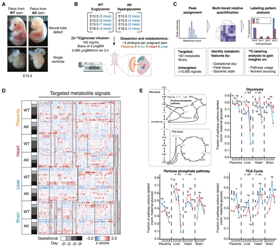(A) 在胚胎第 15.5 天从野生型 (WT) 和秋田型 (AK) 母鼠收获的胎儿图像。(B) 实验设置示意图。(C) 基于 LC-MS 的代谢组数据分析方法示意图。(D) 发育过程中多个时间点从 WT 和 AK 母鼠分离的胎儿组织中胎盘、心脏、肝脏和大脑的靶向代谢物分析的热图表示。(E) 标记的途径碳的预期分数标准化为母体葡萄糖标记的水平。