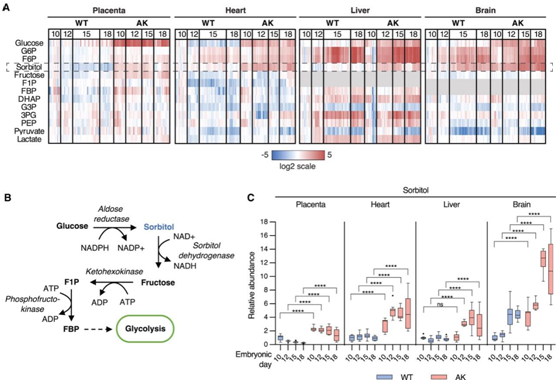 (A) 热图表示相对于野生型 (WT) 母鼠的 E10.5 胎儿组织,糖酵解和多元醇途径中间体的差异倍数。(B) 多元醇途径及其与糖酵解交叉的示意图。(C) 从 WT 和秋田 (AK) 母鼠中分离出的胎儿组织中的山梨醇水平。