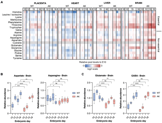 (A) 热图代表相对于从野生型 (WT) 和秋田 (AK) 母鼠分离的 E10.5 胎儿组织的氨基酸水平的变化。(B)胎儿脑组织中的相对天冬氨酸和天冬酰胺水平。(C) 胎儿脑组织中谷氨酸和 GABA 的相对水平。