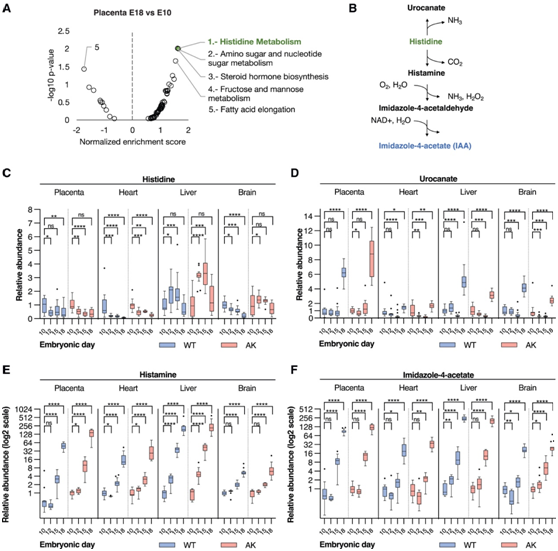 (A) 使用正离子模式非靶向数据的 MetaboAnalyst 通路分析突出显示了胎盘 E18.5 组织中组氨酸代谢相对于野生型母鼠 E10.5 的变化。(B) 组氨酸代谢途径示意图。(C-F)组氨酸及其衍生代谢物、尿酸盐、组胺和咪唑-4-醋酸酯在野生型(WT)和秋田(AK)胎鼠组织中的相对水平。