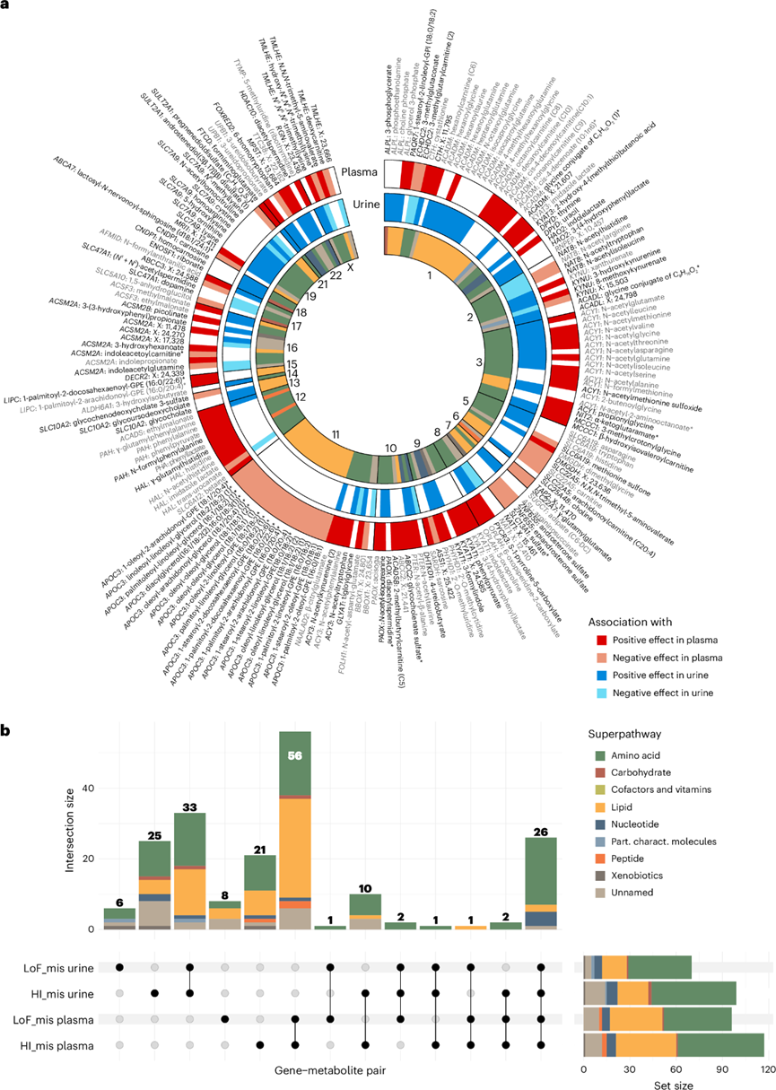 (a) 最外层带显示与血浆代谢物的显著关联(红色;阴影反映效应方向),基因按基因组中的染色体位置排序。中间带显示与尿液代谢物的关联(蓝色;阴影反映效应方向)。(b) UpSet 图显示通过掩码和矩阵识别出的基因-代谢物关联的数量,并按相应的代谢物超通路进行颜色编码。右侧水平条形图表示通过掩码和矩阵识别出的关联的总数。