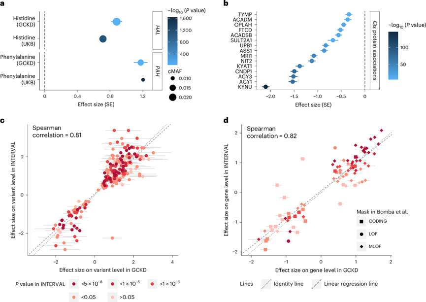 (a) 使用相同的掩码并且仅包括 GCKD 研究和 UKB 中可用的 QV,在 ≥261661 名 UKB 参与者中对显著相关的可用血浆代谢物进行基于基因的检测(y轴),在两项研究中提供非常相似的效应大小(x轴)。条形图表示相应的标准误差 (SE) 。(b) 在 UKB 中测量了 73 个显著代谢物相关基因中的 17 个编码的蛋白质的血浆水平。(c) GCKD 研究中给定血浆代谢物水平的单变量效应大小。(d) 128 个血浆基因-代谢物关联中的 89 个的汇总统计数据。