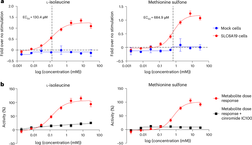 (a) 过表达 SLC6A19 的 CHO 细胞 (SLC6A19 细胞) 及其伴侣 CLTRN 与模拟细胞中L-异亮氨酸和蛋氨酸砜的转运。通过膜电位染料的荧光增加来测量底物转运活性。(b) 桂利胺对过表达 SLC6A19 和 CLTRN 的细胞中 L-异亮氨酸和蛋氨酸砜转运的影响。