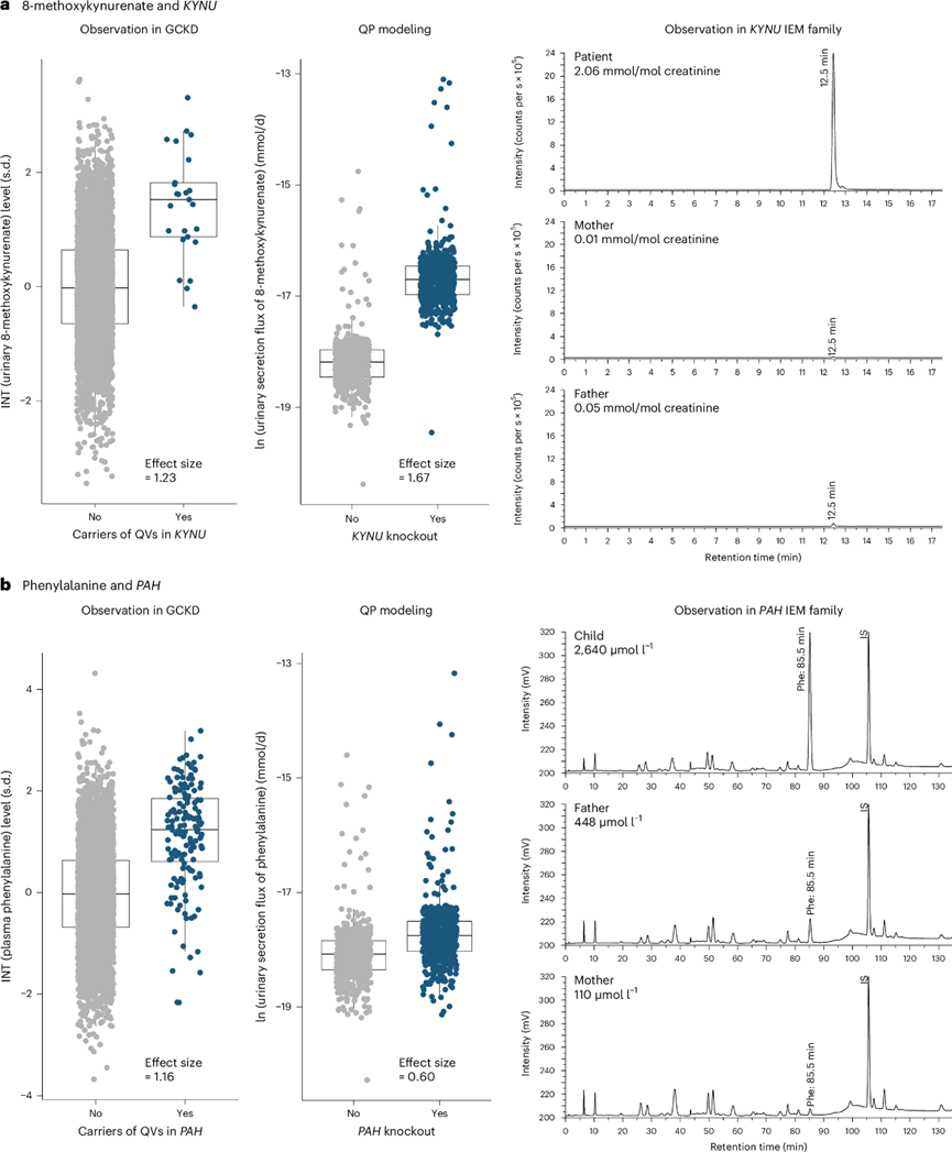 (a-b) 三幅图分别表示与KYNU相关的 8-甲氧基犬尿酸水平和与PAH相关的苯丙氨酸水平。