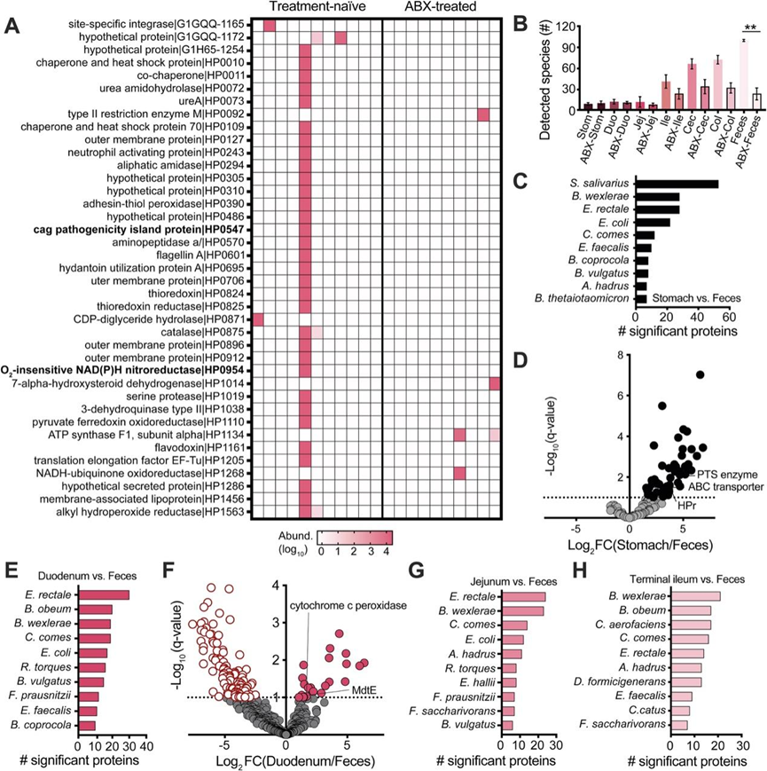 (A-B) 未接受过治疗和接受过抗生素(ABX)治疗的健康成人的粪便和腔内样本。(C) 对于每一种细菌,与粪便相比,胃中重要蛋白质的数量在基因水平上并不显著。(D) 唾液链球菌蛋白质在胃和粪便中的差异丰度。(E) 对于每种细菌,与粪便相比,十二指肠中重要蛋白质的数量在基因水平上并不显著。(F) 十二指肠与粪便中大肠杆菌蛋白质的差异。(G-H) 对于每种细菌,与粪便相比,空肠或回肠中的重要蛋白质数量在基因水平上不显著。