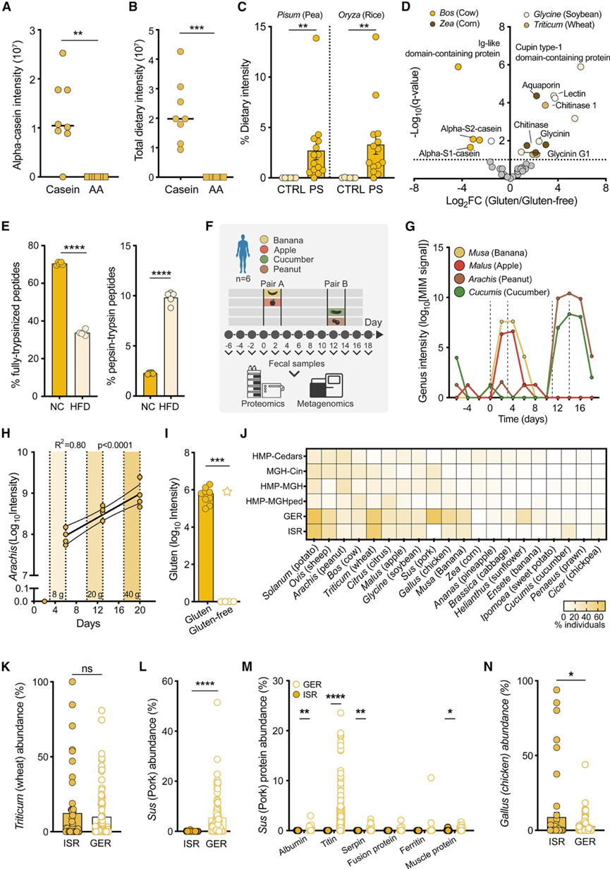 (A-B) α-酪蛋白(S1/S2 同工型组合)和总饮食强度。(C) 相对饮食强度。(D) 膳食蛋白质含量差异大。(E) 检测到具有全胰蛋白酶(左) 或胃蛋白酶-胰蛋白酶 (右)谱的胃肽。(F)实验设计。(G) 平均粪便膳食 MIM 信号强度。(H) 粪便花生 MIM 信号。(I)粪便麸质蛋白丰度。(J) 饮食 MIM 信号。(K-N)不同食物中的蛋白丰度。