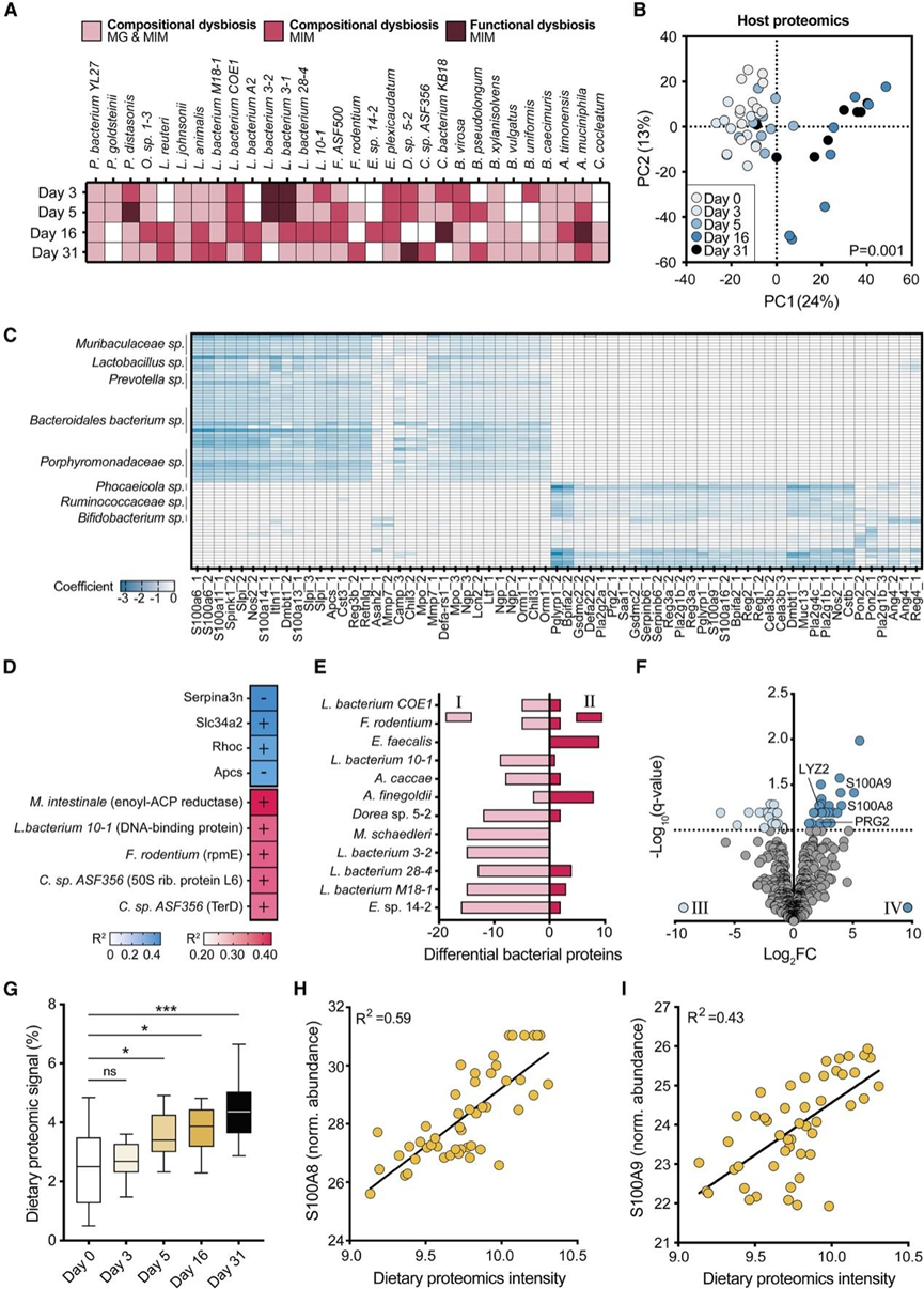 (A) 细菌种类。(B) 主成分分析。(C) 宿主抗菌肽与细菌物种丰度相关。(D) 宿主(蓝色)和细菌(红色)蛋白质与疾病严重程度相关。(E) 差异富集的细菌蛋白。(F) 差异富集的宿主蛋白。(G) 在指定时间点检测到的饮食蛋白质组强度百分比。(H-I) 总膳食蛋白质组学强度与 S100A8 和 S100A9水平之间的相关性。