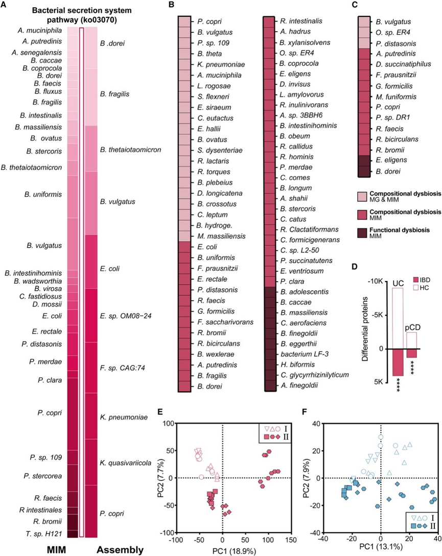 (A) 计算机模拟比较,细菌种类、分泌系统途径 KO03070、MIM(左)或基因组组装(右)的相对贡献。(B-C)细菌种类。(D) 按群组划分的健康个体(白色)和炎症性肠病(IBD,红色)中富集的细菌蛋白数量。(E-F)主成分分析。