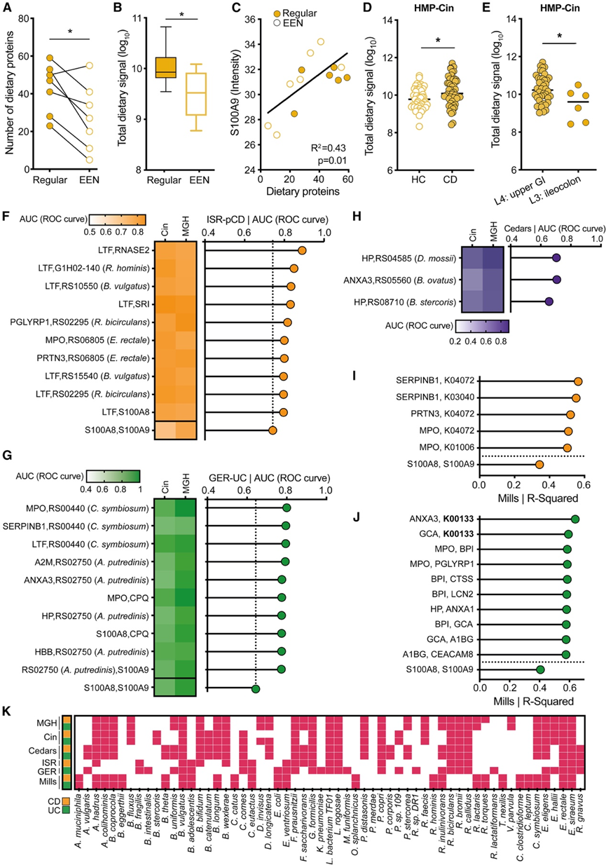 (A) MIM 饮食蛋白质的数量。(B) 总 MIM 饮食信号。(C) 饮食 MIM 信号与钙卫蛋白之间的相关性。(D) 总 MIM 饮食蛋白质丰度。(E) 总饮食蛋白质丰度。(F-G) 种蛋白质组合的CD 和UC 诊断的随机森林分类器。(H) 使用宿主和细菌蛋白、HMP-MGH 和 HMP-Cin 队列区分 UC 和 CD 的随机森林分类器。(I-J) 用于 CD 或 UC 诊断的前 50 种判别蛋白随机组合成一到两种蛋白组。(K) 与 K00133(天冬氨酸半醛脱氢酶)相关的细菌种类。
