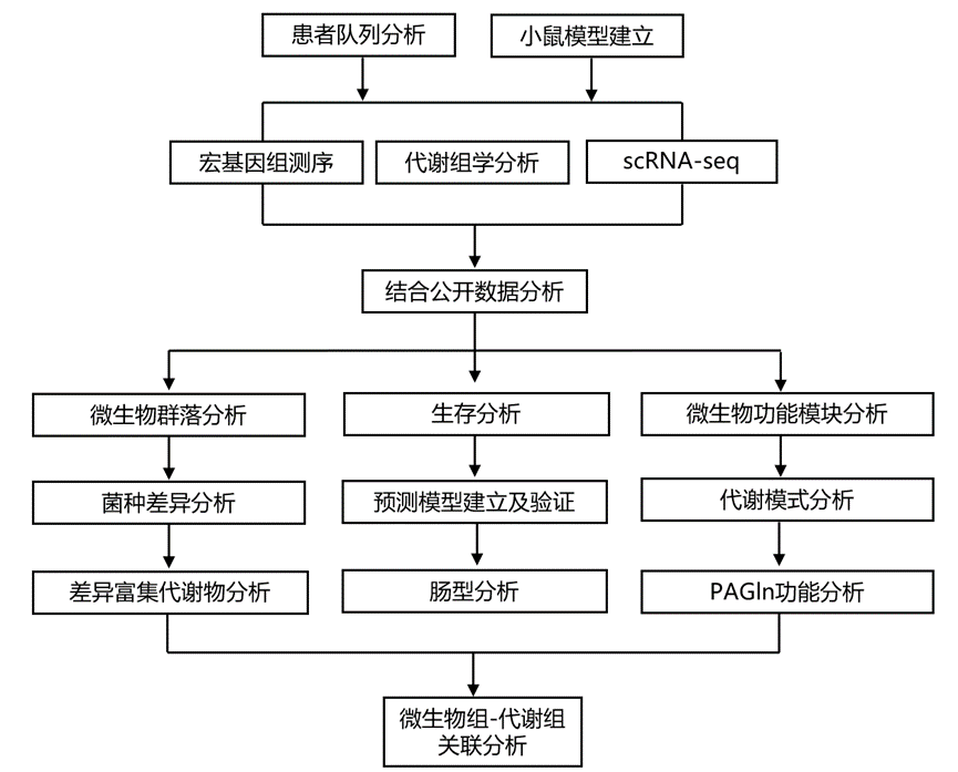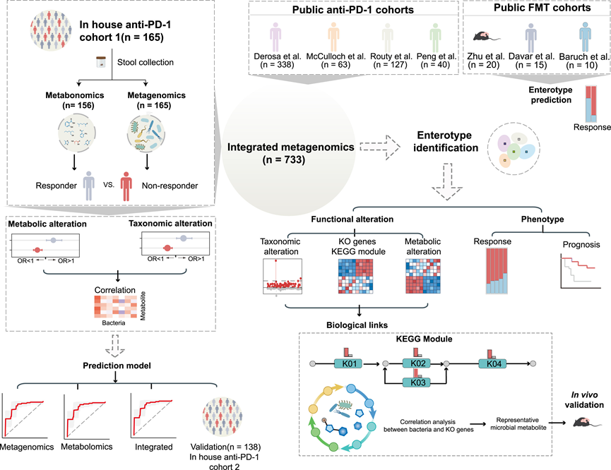本项研究对 165 名接受抗程序性细胞死亡蛋白 1 (PD-1)/程序性死亡配体 1 (PD-L1) 治疗的患者的粪便微生物群和代谢组进行了多组学分析,确定了与治疗反应相关的微生物和代谢实体。整合来自四个公共宏基因组数据集的数据,揭示了跨队列微生物和代谢特征,并在独立队列中进行了验证,结合这些特征的综合预测模型表现出稳健的性能。值得注意的是,本研究表征了五种与反应相关的肠型,每种都与特定的细菌类群和代谢物有关。其中,代谢物苯乙酰谷氨酰胺 (PAGln) 与反应呈负相关,并显示可减弱体内抗 PD-1 疗效。本研究揭示了肠道微生物组、肠道代谢组和免疫治疗反应之间的相互作用,并确定了改善治疗结果的潜在生物标志物。