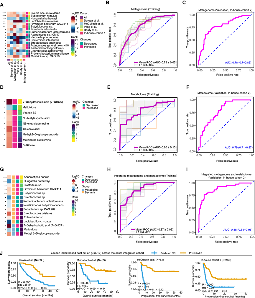 (A,D,G) 热图显示考虑 R 与 NR 宏基因组学、代谢组学以及组合宏基因组学和代谢组学的核心特征。(B,E,H) ROC 曲线显示利用宏基因组学、代谢组学和综合宏基因组学和代谢组学的特征构建的用于响应预测的优化模型的 AUC。(C,F,I) ROC 曲线显示了第 2 组宏基因组学、代谢组学以及综合宏基因组学和代谢组学的预测性能。(J)生存分析。