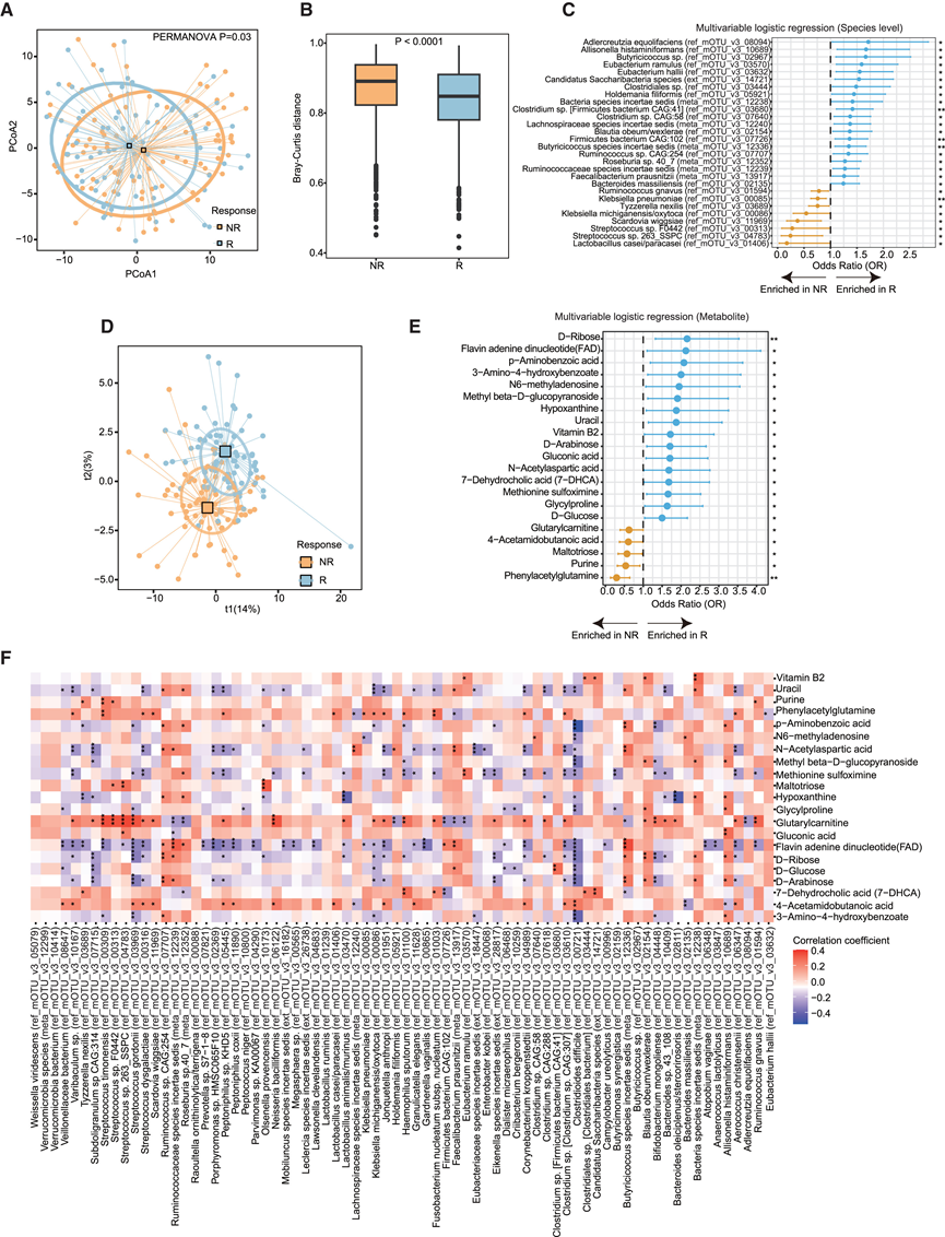 (A) PCoA 图显示 R 和 NR 之间的 beta 多样性差异。(B) 箱线图比较 R 和 NR 之间的 Bray-Curtis 距离的差异。(C) 森林图显示 R 和 NR 之间细菌种类的差异。(D) 正交投影至潜在结构判别分析(OPLS-DA)得分图,显示 R 和 NR 之间的整体代谢组学概况。(E) 森林图显示 R 和 NR 之间差异富集的细菌代谢物。(F) 热图显示了考虑抗生素使用后改变的细菌和代谢物之间的偏相关性。