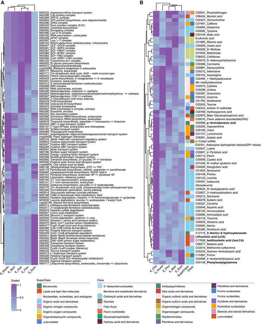 (A) 热图显示每种肠型中前 20 个显著富集的 KEGG 模块。(B) 热图显示与肠型显著相关的代谢物。