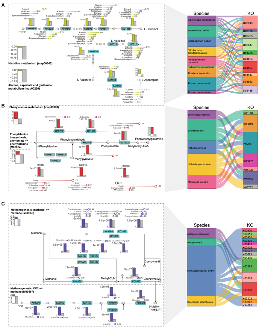 (A-C) 左:参与从 KEGG 通路图修改而来的通路模块的代表性 KO 基因。右:桑基图显示了左图显示的携带 KO 基因的特定细菌。